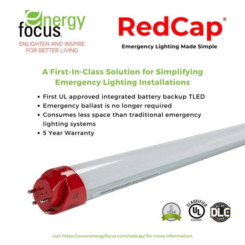 Is your building backed up and ready to go in the event of an emergency? Well have no fear, Energy Focus RedCap® Emergency Battery Backup is here! An all-in-one general purpose lighting and battery-powered emergency backup TLED solution.