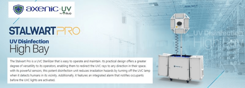 Introducing Axenic-UV StalwartPro UV Disinfection High Bay, a UVC Sterilizer that is easy to operate and maintain. This potent disinfection unit reduces irradiation hazards by turning off the UVC lamp when it detects humans in its vicinity. Additionally, it features an integrated alarm that notifies occupants before the UVC lights are activated.