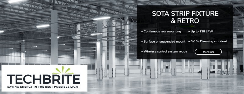 Check out TechBrite‘s SOTA LED Fixture, a quick, easy, and economical way to modernize any commercial and industrial space. Building upon the Strip Fixture platform, the SOTA LED Fixture is constructed with quality pre-painted steel designed to withstand tough environments. TechBrite‘s SOTA LED Fixture blends high LPW—as much as 135 LPW—with an economical design. The SOTA LED Fixture is easily customizable with sensors, wireless controls, cords, hanging kits—just to mention a few. New construction or retrofitting an existing space TechBrite‘s SOTA LED Fixture is the perfect solution.