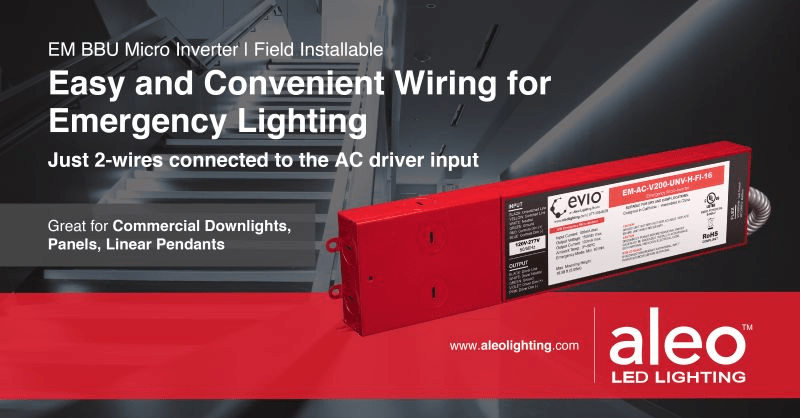 Aleo Lighting‘s AC Emergency Battery Backup Micro-Inverter offers an emergency lighting solution where access to luminaire LED arrays is not convenient.