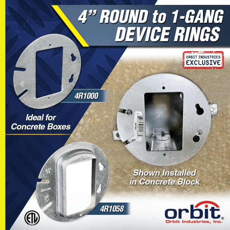 What are you waiting 4!? Take a look at Orbit Industries 4” Round Cover that transitions into 1-Gang device opening, made to fit Concrete and 4O Boxes.