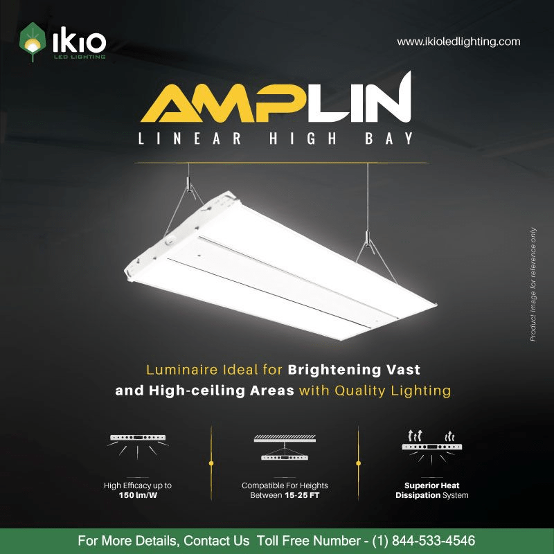 Amp up your lighting with IKIO LED Lighting‘s Amplin Linear High Bay. Available with wide-angle optics, multiple lumen packages, and various mounting heights. Versatile and durable.