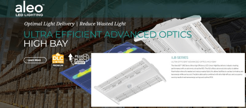 Take a look at Aleo Lighting‘s ILB Series, their ultra efficient advanced optics high bays. Industry-leading performance with an extremely attractive ROI.