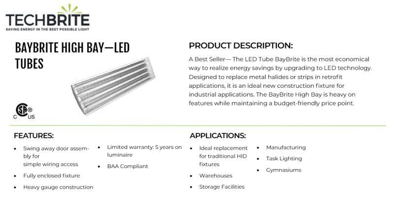 TechBrite‘s LED Tube Baybrite is an upgrade in LED technology. Great for INDUSTRIAL APPLICATIONS such as: