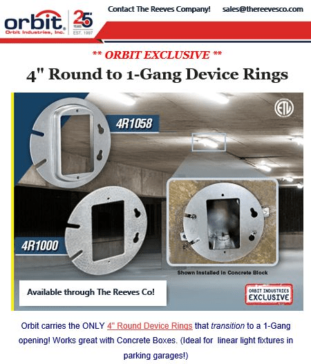 Orbit Industries carries the ONLY 4″ Round Device Rings that transition to a 1-Gang opening!