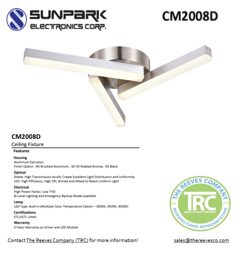 For example, take a look at their CM2008D Light Fixture. Sleek and elegant, made with three finish options to choose from. High Power Factor, Low THD, with Bi-Level Lighting and Emergency Backup Models available.