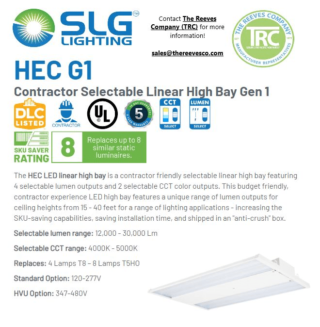 SLG Lighting®‘s HEC LED Linear High Bay is made to be budget friendly while providing a range of lumen outputs for ceiling heights from 15 – 40 feet. Part of SLG Lighting®‘s Contractor Series!