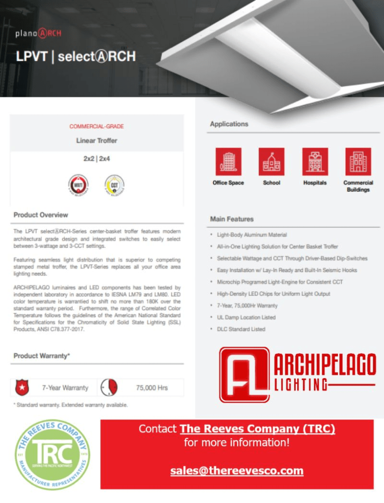 Update the lighting with Archipelago Lighting, Inc.‘s LPVT SelectARCH Series Center Basket Troffer. Features a modern architectural grade design and integrated switches to easily select between 3-Wattage and 3-CCT settings.