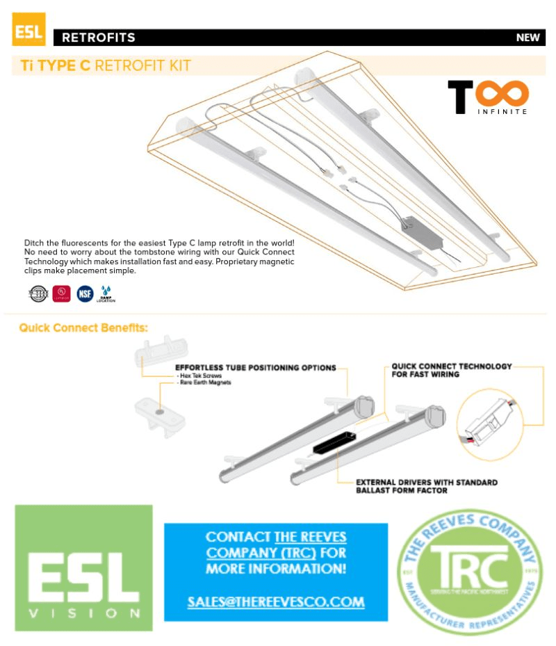 Trade the ol fluorescents for ESL Vision‘s New Type C Lamp Retrofits! Their Quick Connect Technology makes installation fast and easy.
