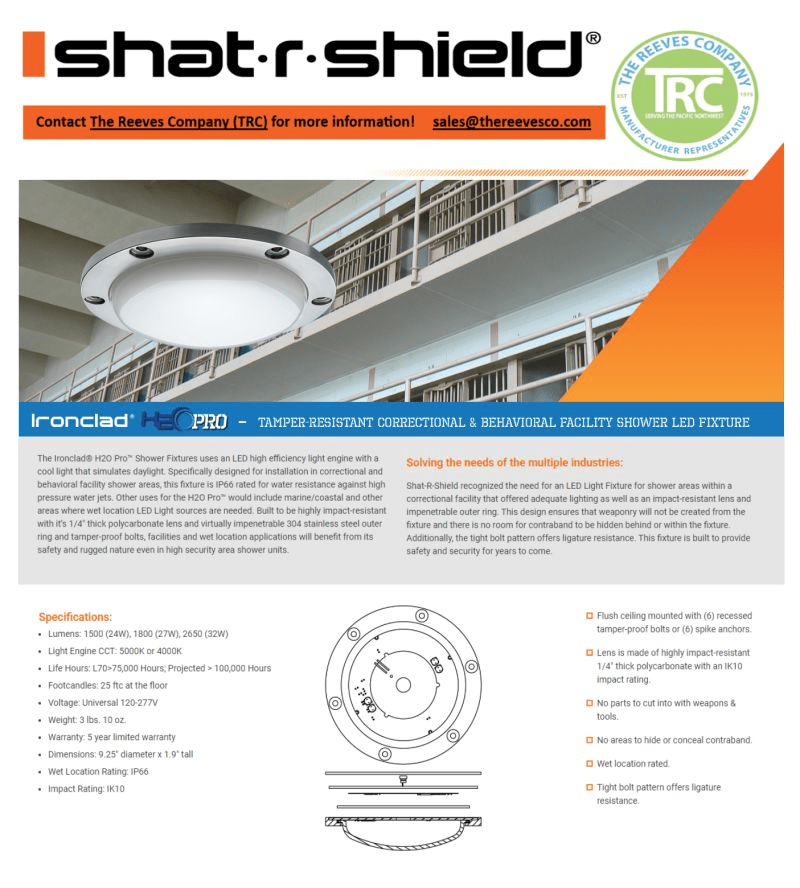 Shat·R·Shield Lighting Inc.‘s Ironclad H2O PRO Tamper Resistant Correctional & Behaviroal Facility Shower LED Fixture ensures that weaponry will not be created from the fixture and there is no room for contraband to be hidden behind or within the fixture. 🚫🔪🚫