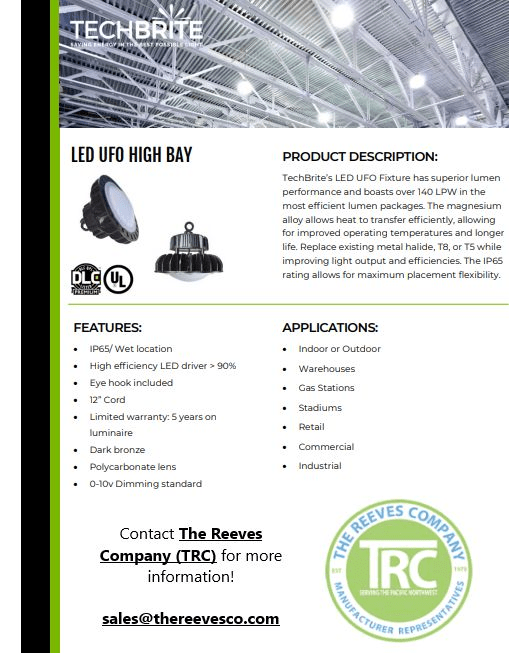 Take a look at TechBrite‘s LED UFO High Bays. This fixture delivers superior lumen performance and boasts over 140 LPW! A great option for: