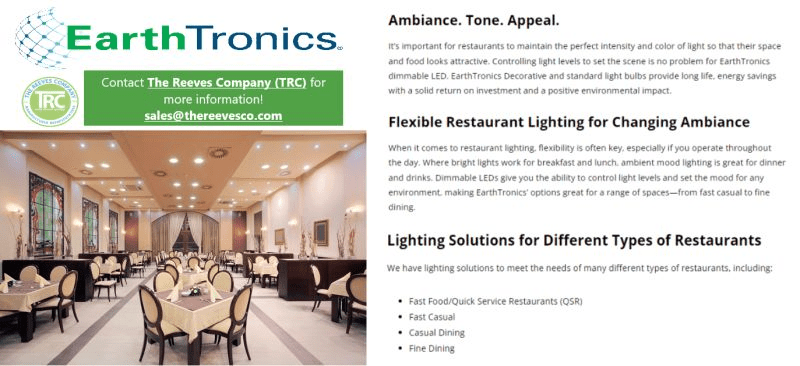 EarthTronics, Inc. – Energy Efficient Lighting Products understands the importance of quality lighting in restaurants. Proper lighting makes the atomosphere and food look attractive. That’s one way to create repeat customers at both Fast and Fine Dining establishments. 🍔🍟🍽🥩🍣