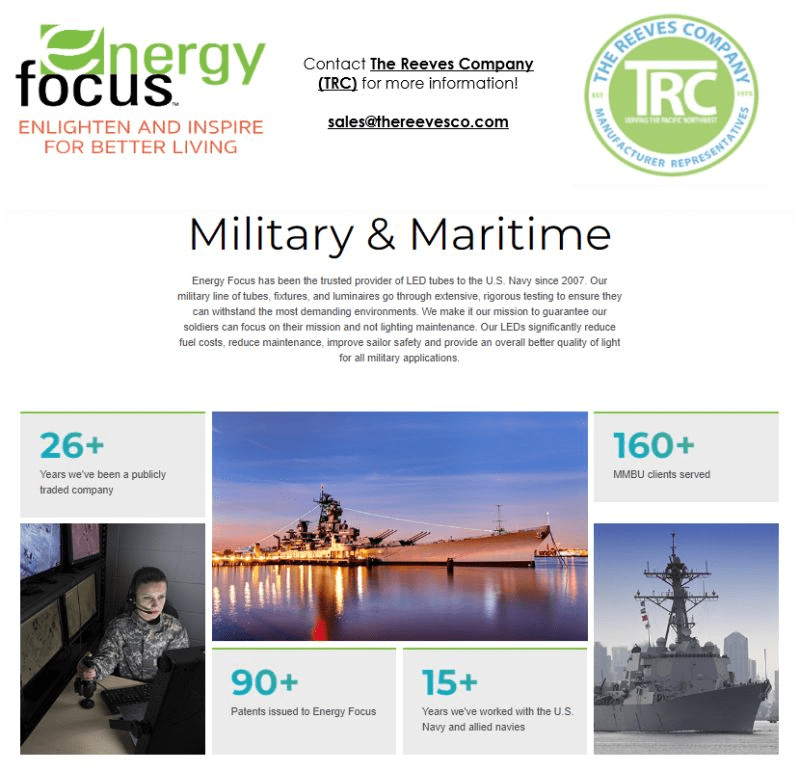 Learn more about Energy Focus by contacting The Reeves Company PNW!