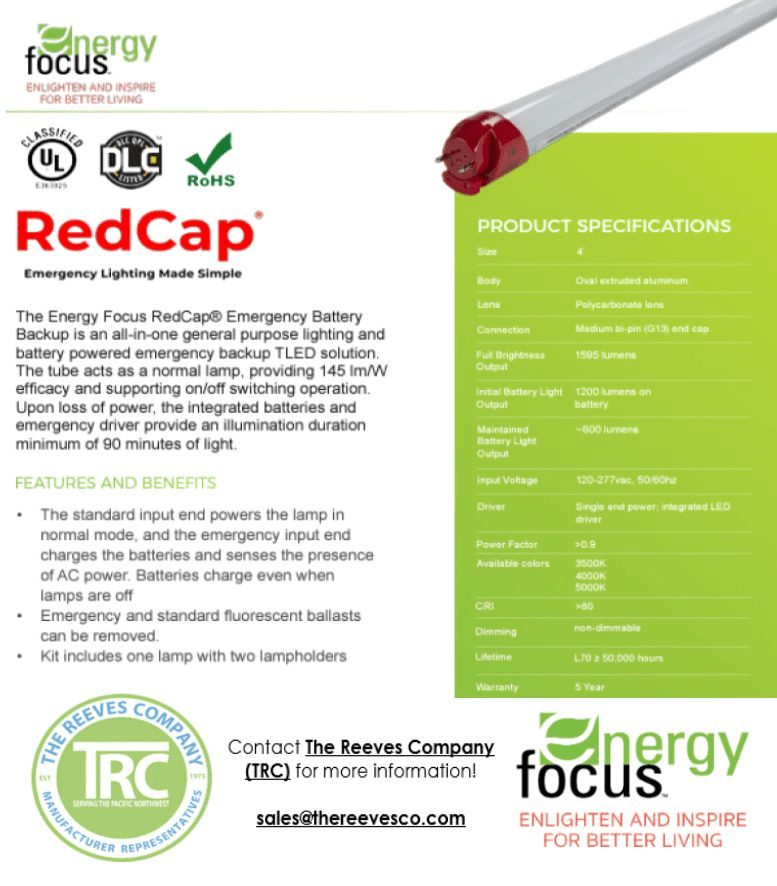You’ll be seeing RED (in a good way) with Energy Focus‘s RedCap Emergency Battery Backup. The tube is a vibrant lamp that provides 145 lm/W efficiency while in action. Upon loss of power, the integrated batteries and emergency driver kick in and provide a minimum of 90 minutes of light. Batteries charge even when lamps are off.
