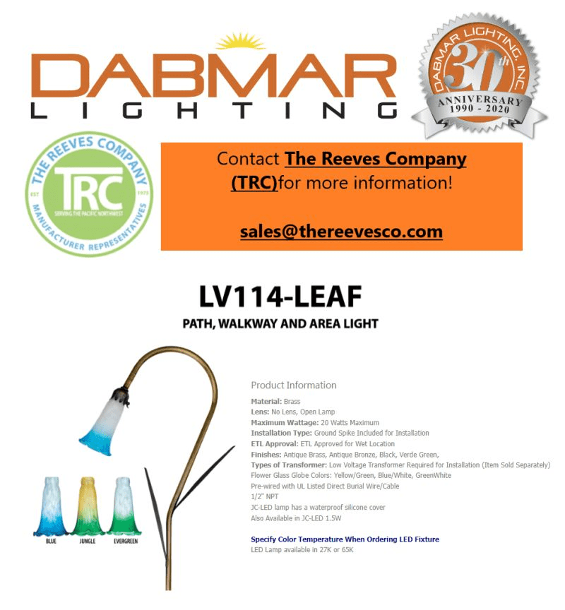 Bloom into spring with Dabmar Inc.‘s LV114-LEAF Path/Walkway/Area Light! Available in 4 Finishes and 4 Flower Glass Globe Colors. Approved for Wet Locations (We don’t have any of those in the PNW 🤣). Add some FLORA to your property while the real FLORA slowly make their appearance!