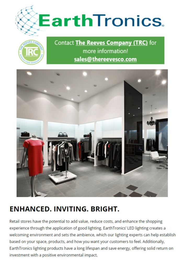 EarthTronics, Inc. – Energy Efficient Lighting Products are prime for Retail Applications! EarthTronics, Inc. – Energy Efficient Lighting Products create a welcoming environment and set the ambience. π‘π¬ππ π’