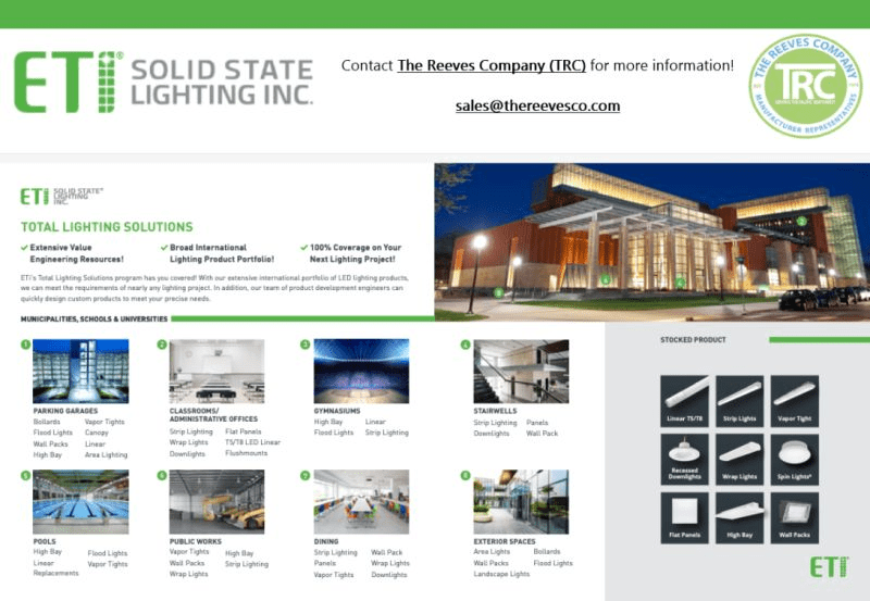 Having the proper lighting helps with attentiveness and productivity. ETi Solid State Lighting, Inc. has put together a lighting guide for Schools & Universities. Take a look at their suggestions for each unique space. And….if you’re still not sure where to get started, contact Dustin Mackinnon, Regional Application Specialist with The Reeves Company.