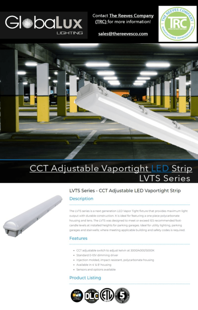 GlobaLux Lighting CCT Adjustable Vapor Tight LVTS Series LED Strip Fixtures provide maximum light output with durable construction. Ideal for featuring a one piece polycarbonate housing and lens. A wonderful fit for Applications such as: