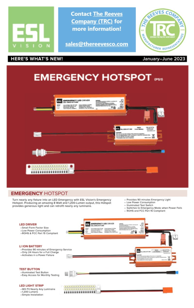 Turn nearly any fixture into an LED Emergency spot with ESL Vision‘s Emergency Hotspot! This NEW solution provides generous light and can retrofit nearly any luminaire! LI ION Battery provides 90 minutes of emergency services and requires only 24 hours for a full charge. Now that’s HOT. 🔥🔴