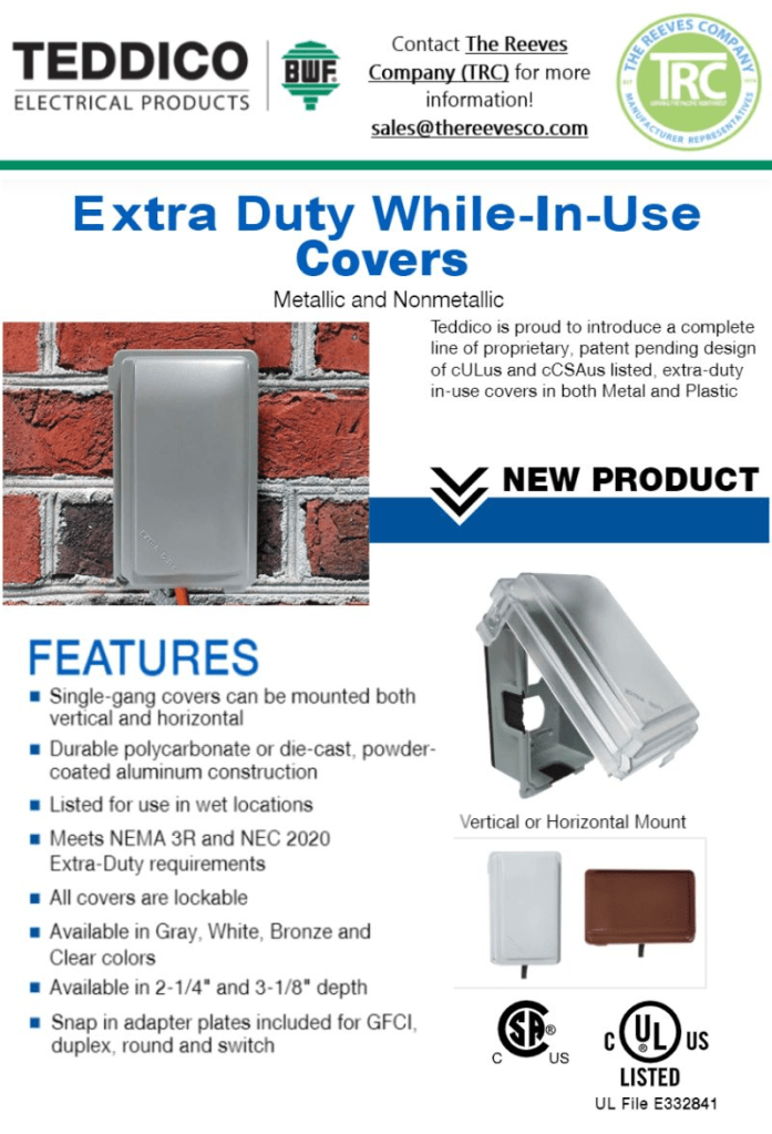 Teddico/BWF have added Extra Duty While-In-Use Covers to their catalog. Listed for use in Wet Locations, these covers are a great option for rainy areas…like the Pacific Northwest. Available in Gray, White, Bronze, and Clear Colors.