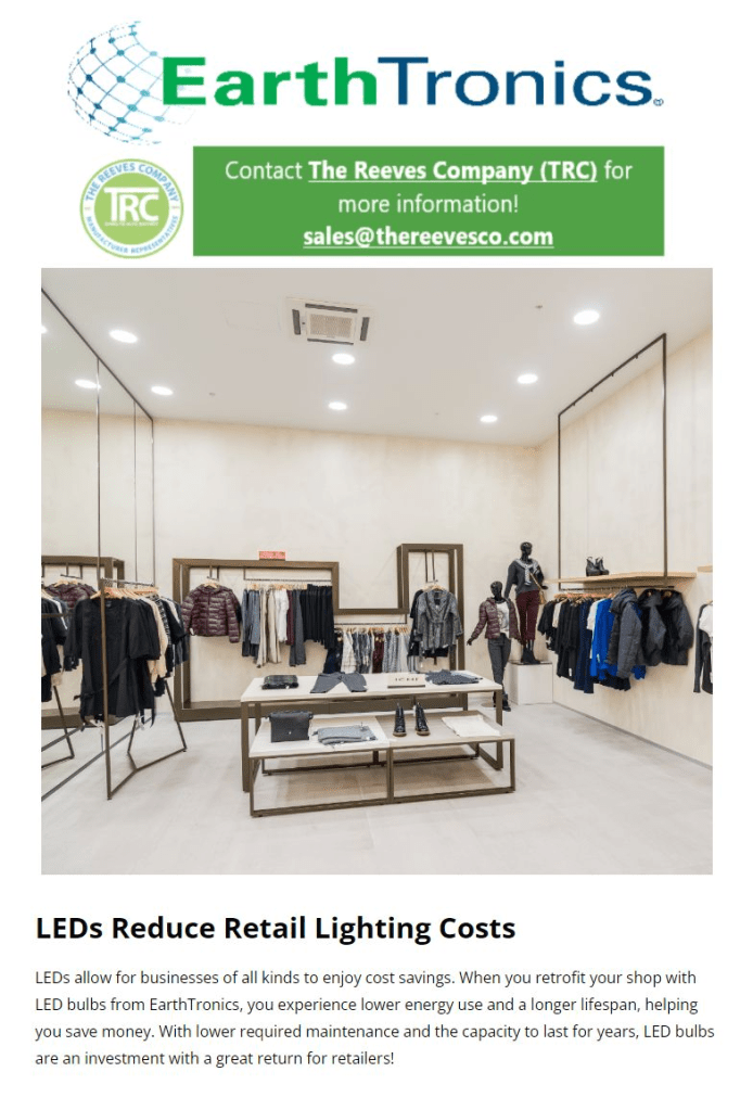 EarthTronics, Inc. – Energy Efficient Lighting Products understands the importance of proper lighting in Retail Applications. Too low of lights can deter someone from shopping. The wrong color temperature can distort the actual colors of a product. And the wrong types of bulbs can blow through energy and money. With lower required maintenance and the capacity to last for years, LED Bulbs are an investment with a great return for Retailers!
