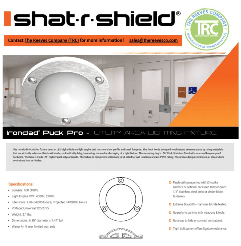 Shat·R·Shield Lighting Inc. Ironclad Puck Pro Utility Area Lighting Fixtures are created to withstand extreme abuse by using materials that are virtually indestructible and drastically delay tampering, removal, or damaging of a light fixture. The unique design eliminates all areas where contraband can be hidden.