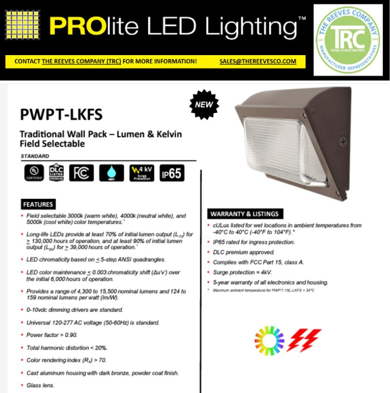 NEW PWPT-LKFS Lumen and Kelvin Field Selectable Traditional Wall Packs are now available from Emergensee / PROlite LED Lighting !!! Cast aluminum housing available with dark bronze or powder coat finish. Increase outdoor visibility at: