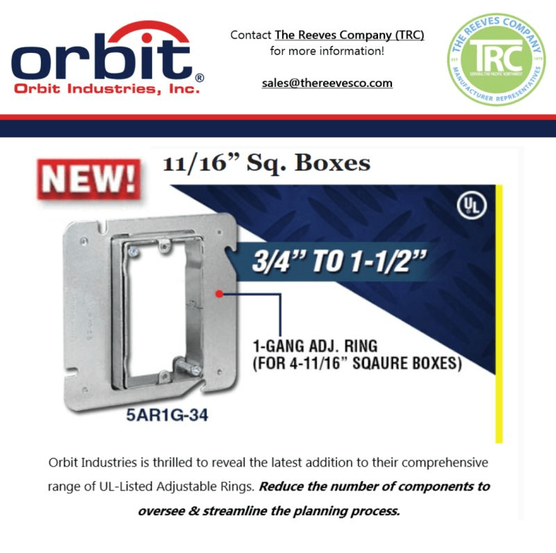 Introducing the latest addition to Orbit Industries range of UL-Listed Adjustable Rings. Take a look at their NEW 11/16″ Sq Boxes! Reduce the number of components to oversee and streamline the planning process.