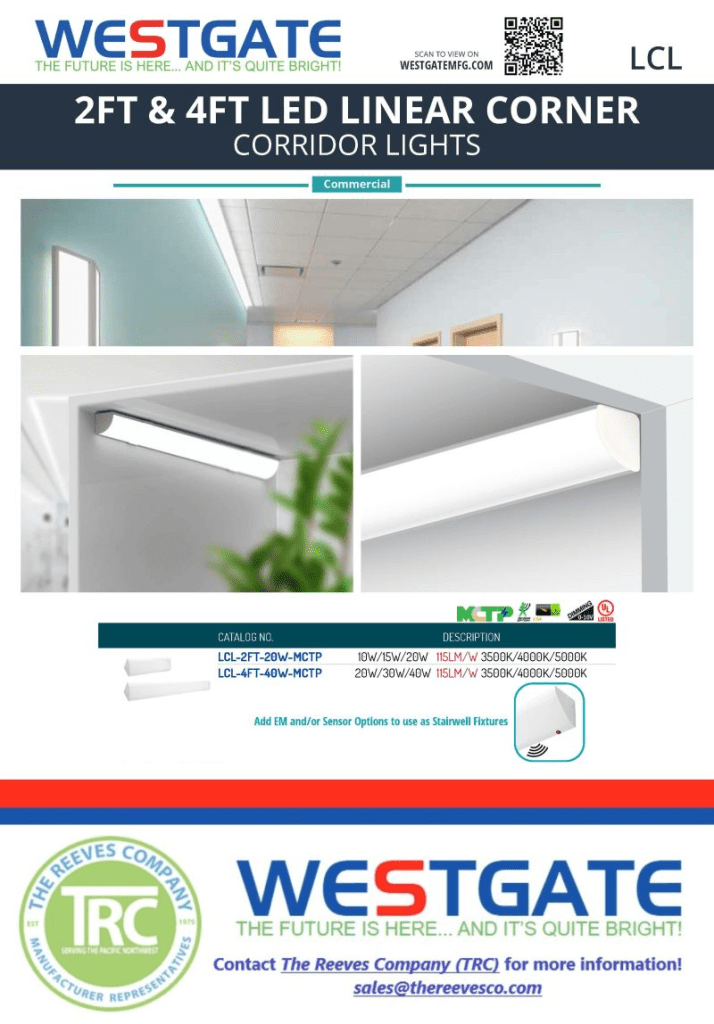 Light up small corridors with Westgate Mfg‘s 2FT and 4FT LED Linear Corner Corridor Lights! Small but mighty. Add EM and/or Sensor Options to use as stairwell fixtures.