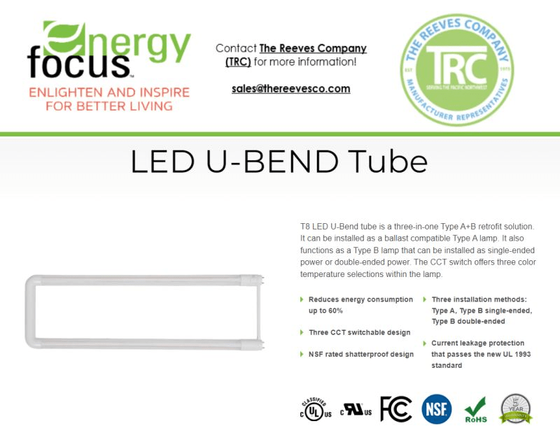 Energy Focus T8 LED U-BEND Tube is a three-in-one Type A+B Retrofit solution.