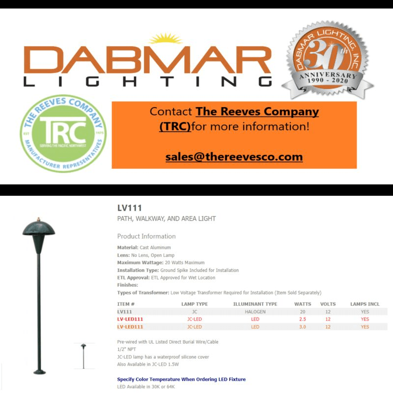 Add sophisticated lighting to your home with Dabmar Inc.‘s LV111 Path, Walkway, and Area Light. JC-LED Lamp has a waterproof silicone cover making this a great option for Pacific Northwest landscapes. Make updates to outdoor areas like: