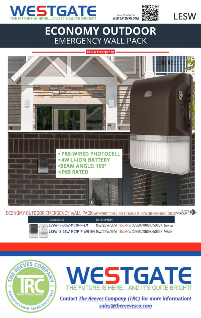 Westgate Mfg‘s Economy Outdoor Emergency Wall Packs are an easy way to add convenient, Emergency Lighting to the exteriors of buildings and job sites. Small but bright and rugged enough to withstand that Pacific Northwest weather.