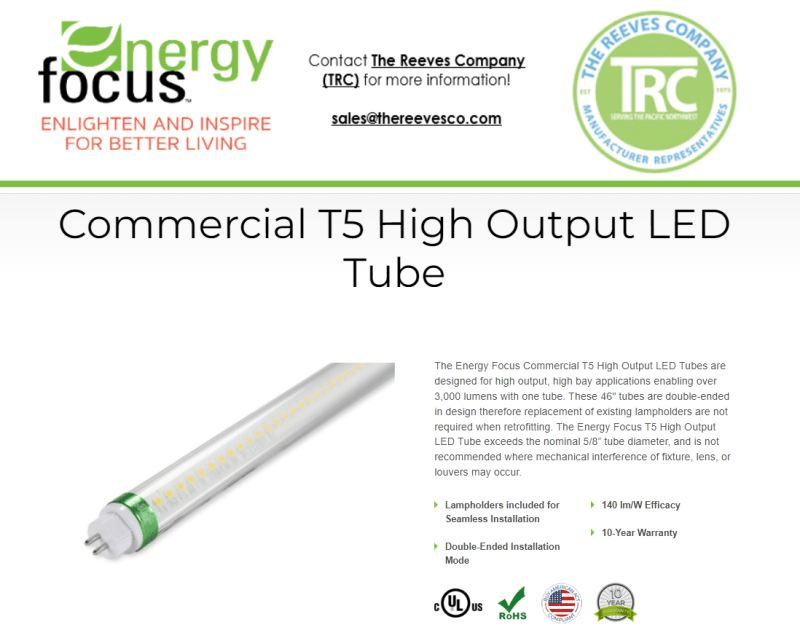 Then FOCUS your attention on Energy Focus‘ Commercial T5 High Output LED Tubes. Lampholders are included for seamless installation.