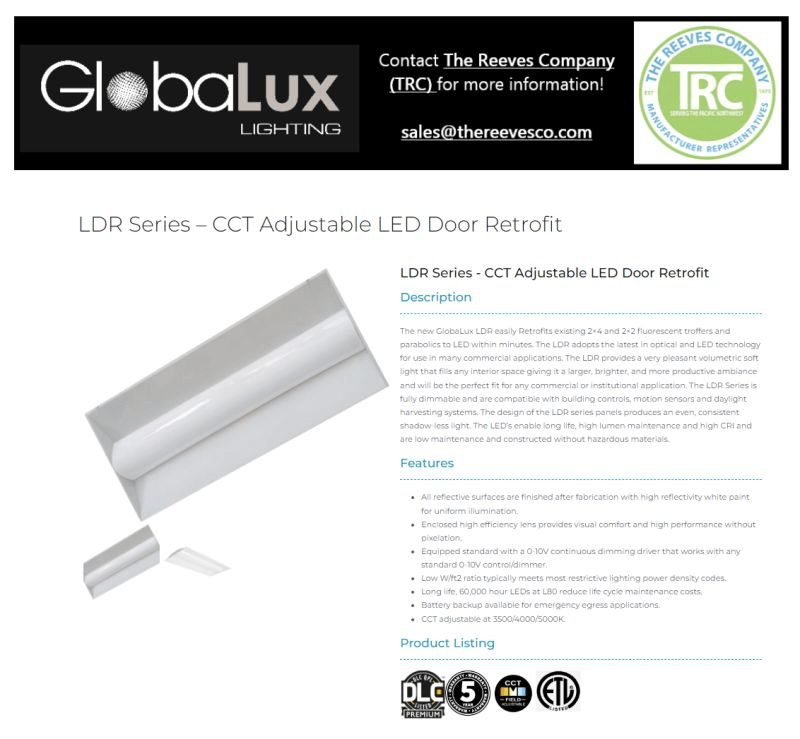 GlobaLux Lighting LDR Series, CCT Adjustable LED Door Retrofit easily retrofits existing 2×4 and 2×2 fluorescent troffers and parabolics to LED within minutes! The LDR applies the latest in optical and LED technology to many Commercial Applications like: