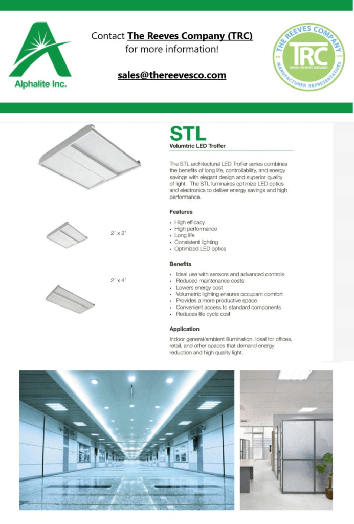 Alphalite‘s STL Volumtric LED Troffer combines the benefits of long life, controllability, energy savings, and elegant design all into one top quality troffer. Compatible with sensors and advanced controls. Add simplicity to: