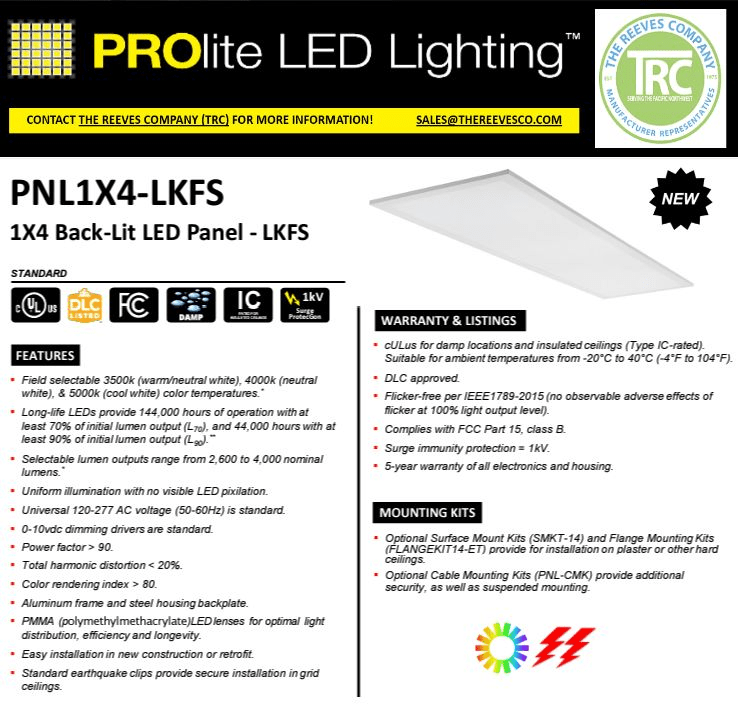 Emergensee / PROlite LED Lighting ‘s PNL1X4-LKFS 1X4 Back-Lit LED Panel is ready to work hard and light bright. Field selectable color temperatures and long-life LEDs provide up to 144,000 hours of operation with at least 70% of initial lumen output and 44,000 hours with at least 90%. π€©