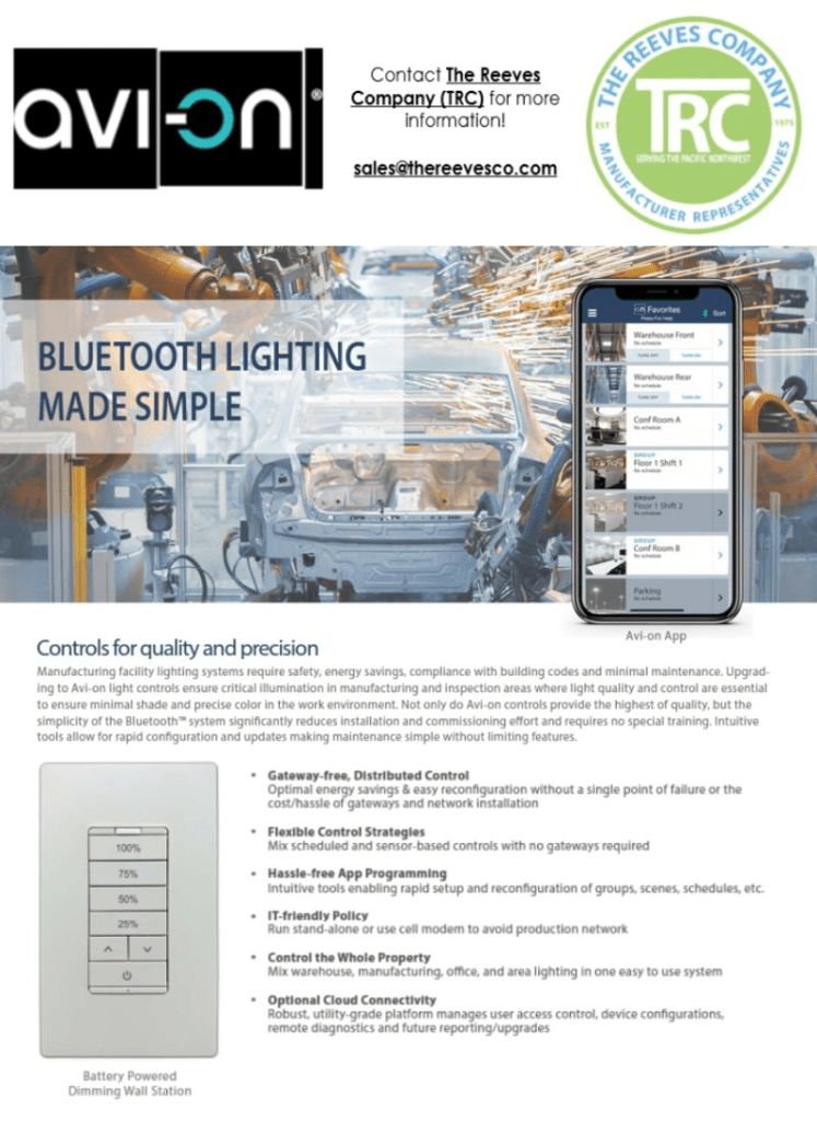 Manufacturing Facilities require a lot from their lighting. Safety, energy efficiency, savings, compliance with building codes, and easy maintenance just to name a few. Avi-on Labs, Inc. created a Bluetooth, Gateway-Free, Lighting Controls System to simplify all those requirements.