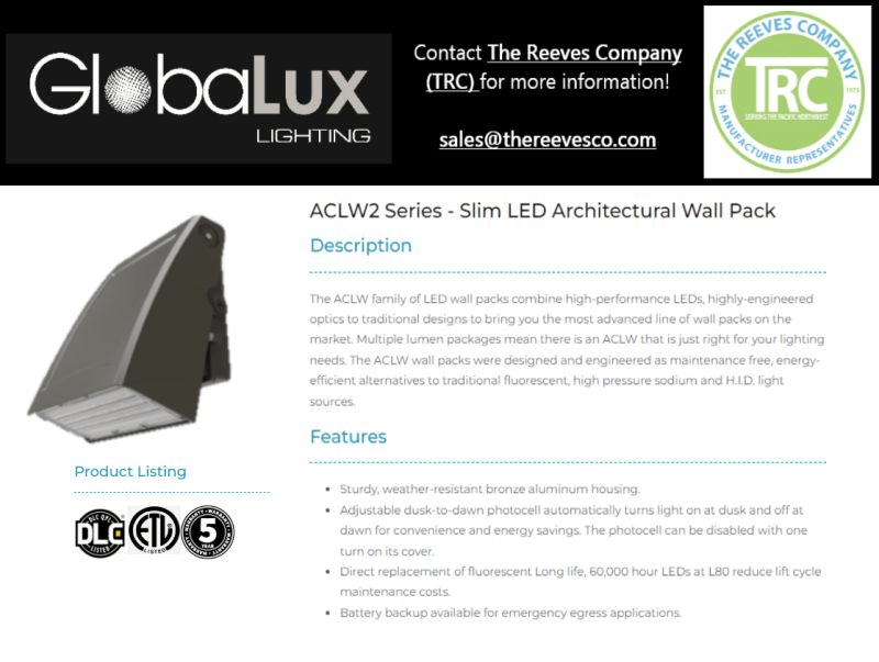 Now that it’s getting darker earlier in the Pacific Northwest, well lit spaces are going to be necessary. Make sure your exteriors are shining bright with GlobaLux Lighting‘s ACLW2 Series Slim LED Architectural Wall Pack.