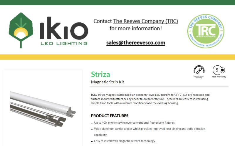 Take a peek at IKIO LED Lighting‘s Striza Magnetic Strip Kit. This Kit is an economy level LED retrofit for 2×2 and 2×4 recessed and surface mounted troffers or any linear fluorescent fixture.