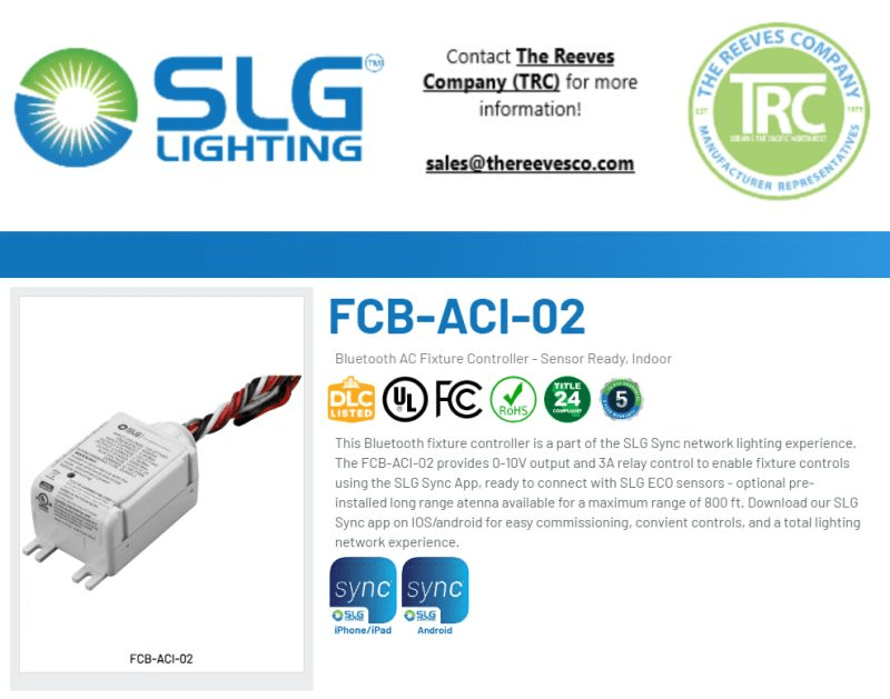 SLG Lighting®‘s FCB-ACI-02 Bluetooth AC Fixture Controller (Sensor Ready, Indoor) is part of the SLG SYNC network lighting experience. 📶🏢
