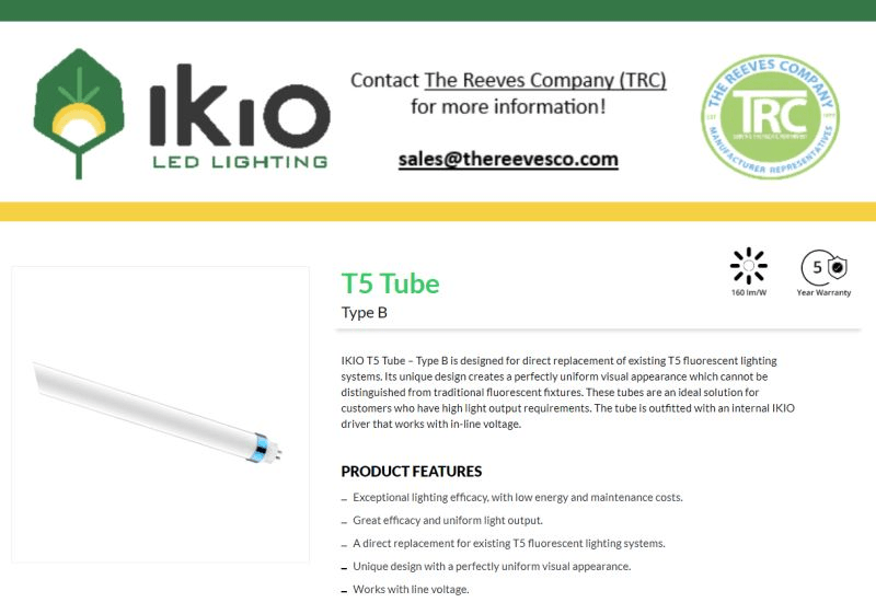 IKIO LED Lighting‘s Type B T5 Tube is designed for direct replacement of existing T5 fluorescent lighting systems. Designed to create a perfectly uniform visual appearance. Outfitted with an internal IKIO driver that works with in-line voltage.