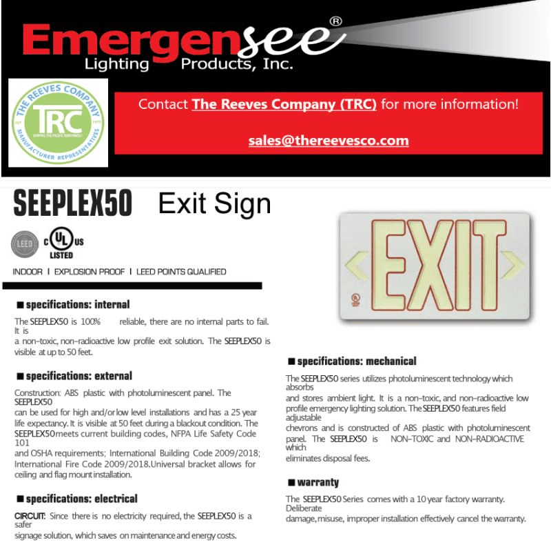 Looking for fool proof Emergency Exit Signs? Emergensee / PROlite LED Lighting ‘s SEEPLEX50 is 100% reliable. There are NO internal parts to fail! The SEEPLEX50 series utilizes photoluminescent technology which absorbs and stores ambient light.