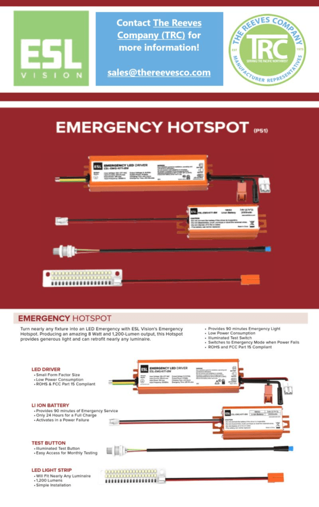 Turn nearly any fixture into an LED Emergency spot with ESL Vision‘s Emergency Hotspot! This NEW solution provides generous light and can retrofit nearly any luminaire! LI ION Battery provides 90 minutes of emergency services and requires only 24 hours for a full charge. Now that’s HOT. π₯π΄