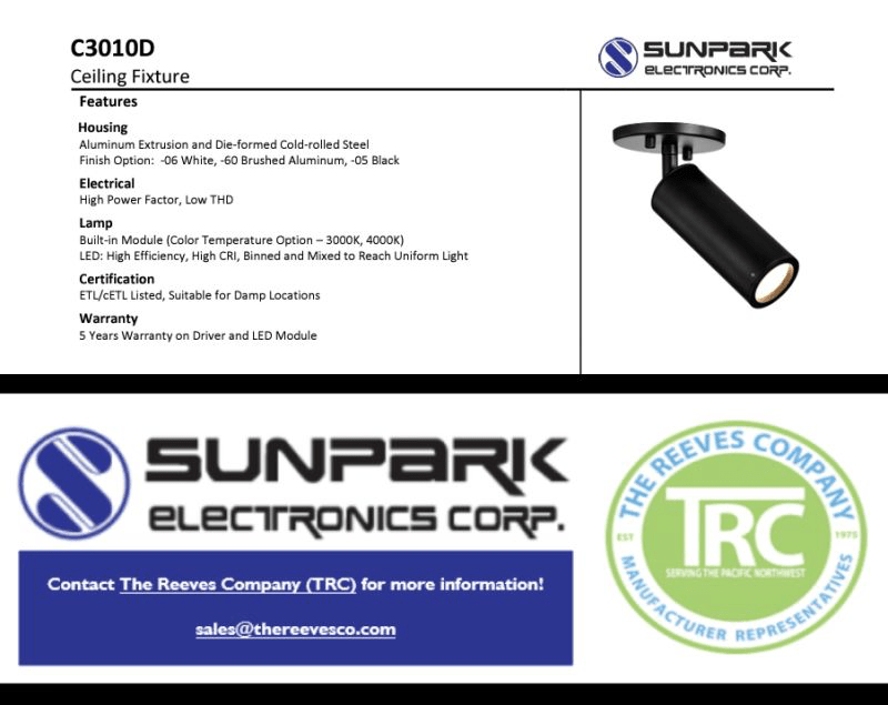 Take a look at Sunpark Electronics Corporation‘s C3010D Ceiling Fixture. This luminaire is both small and mighty. Add a spotlight to a number of spaces and places.